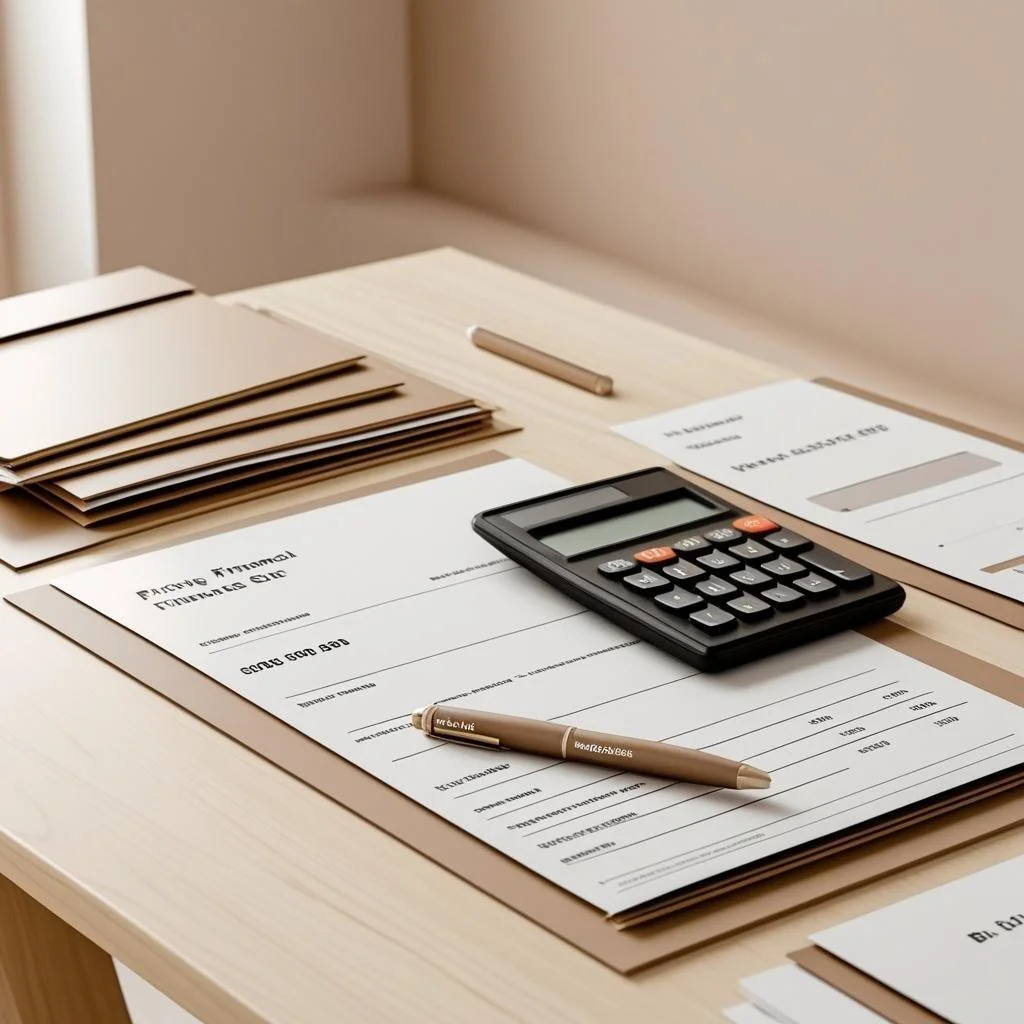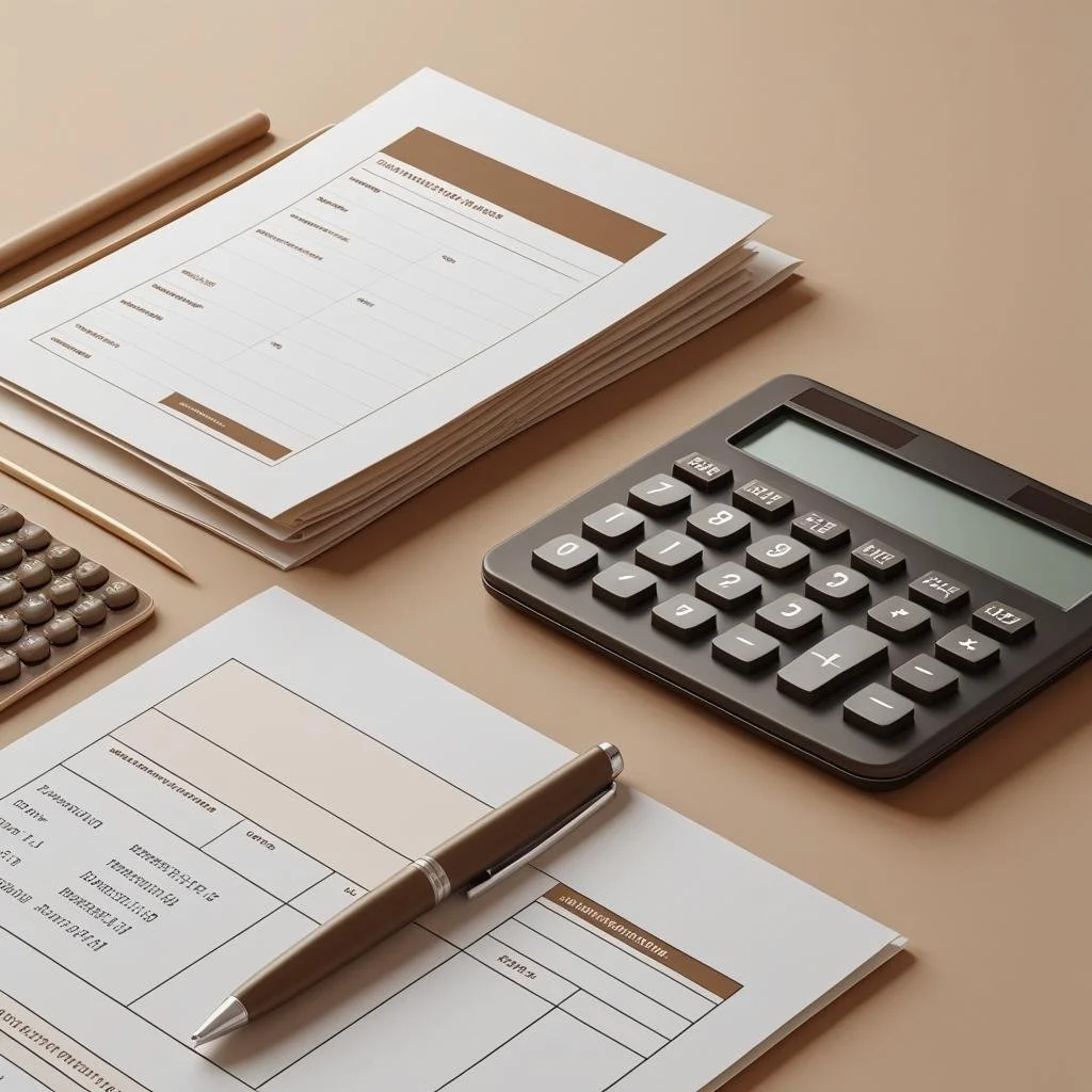 Financial documents, a calculator, a pen, and a pencil on a beige desk, indicating a setting for budgeting or accounting work.