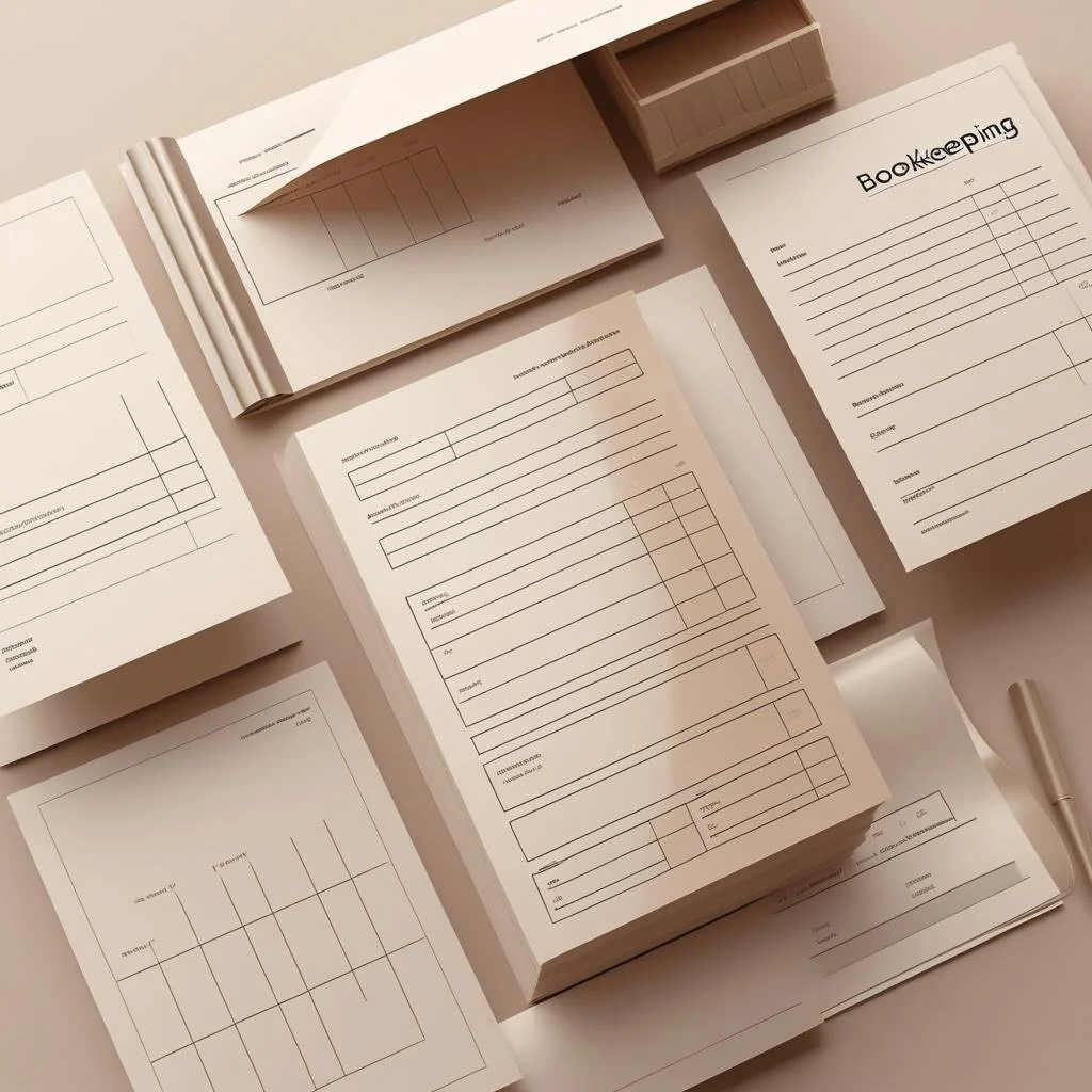 Various bookkeeping and accounting forms and sheets on a desk, including spreadsheet pages, a bookkeeping worksheet, and a small box, all laid out for financial record keeping.